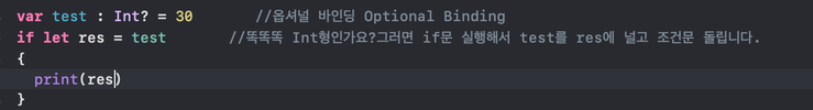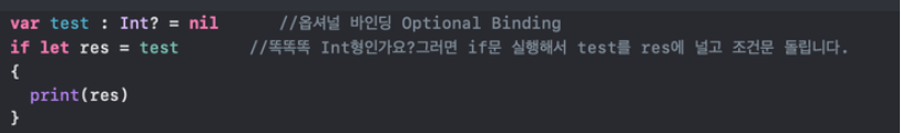 옵셔널이 없으면 좋겠지만, 사용하게 된다면, 옵셔널 바인딩과 강제 언래핑을 사용한다.